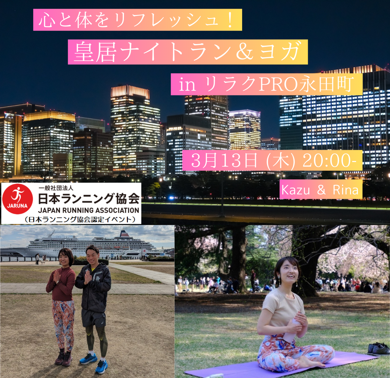 | イベント名 | : | 心と体をリフレッシュ!皇居ナイトラン&ヨガ in リラクPRO永田町 |