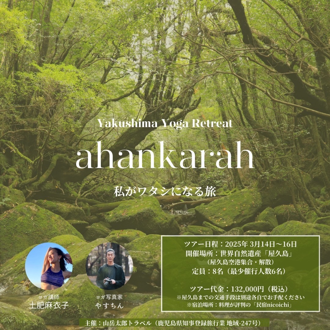 | 実施内容 | : | Yakushima Yoga Retreat 日々の生活をしていると 何か足りないんじゃないか 知らず知らずの内に 私はよくありました そして「今の自分が許せない」と もし今、そんな気持ちが何処かにあるなら 何者でも無いワタシ リトリートが終わった後 ________________ 開催日: 2025年3月14日〜16日 企画・主催: 株式会社山岳太郎 ヨガ講師 土肥麻衣子 ツアー帯同カメラマン ツアーサポート担当 宿で料理・ボディーケア担当 |