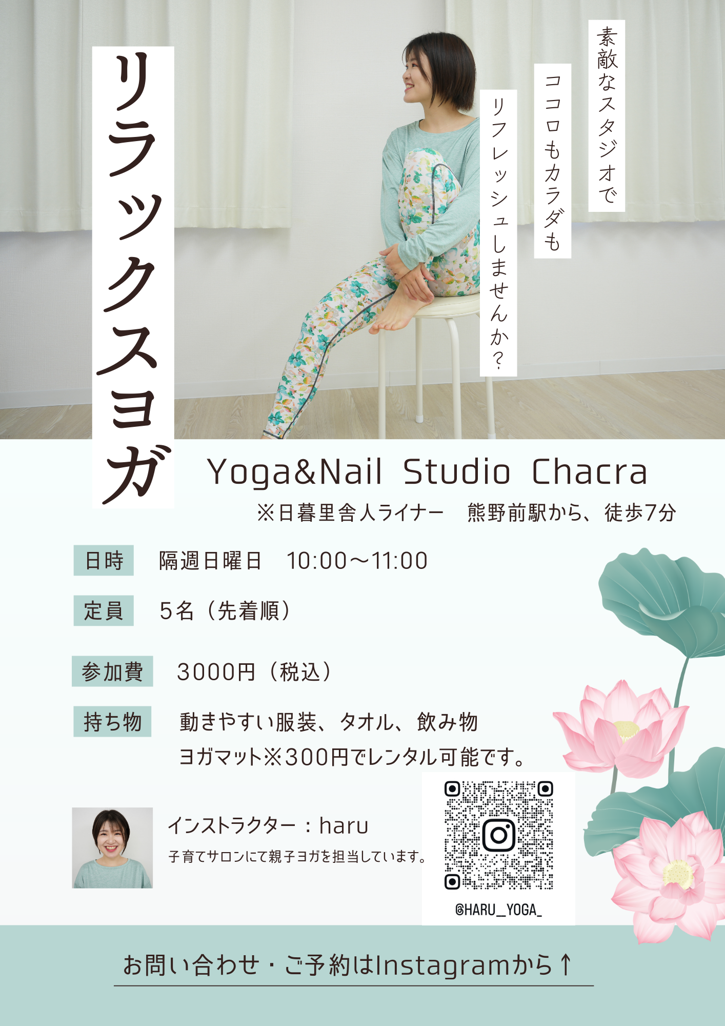 | 開催場所 | : | 荒川区東尾久5丁目21 Yoga&Nail studio Chacra |