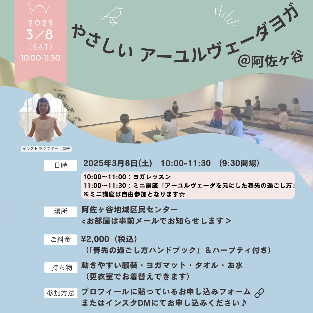 | イベント名 | : | やさしいアーユルヴェーダヨガ@阿佐ヶ谷【ミニ講座:春先の快適な過ごし方】 |