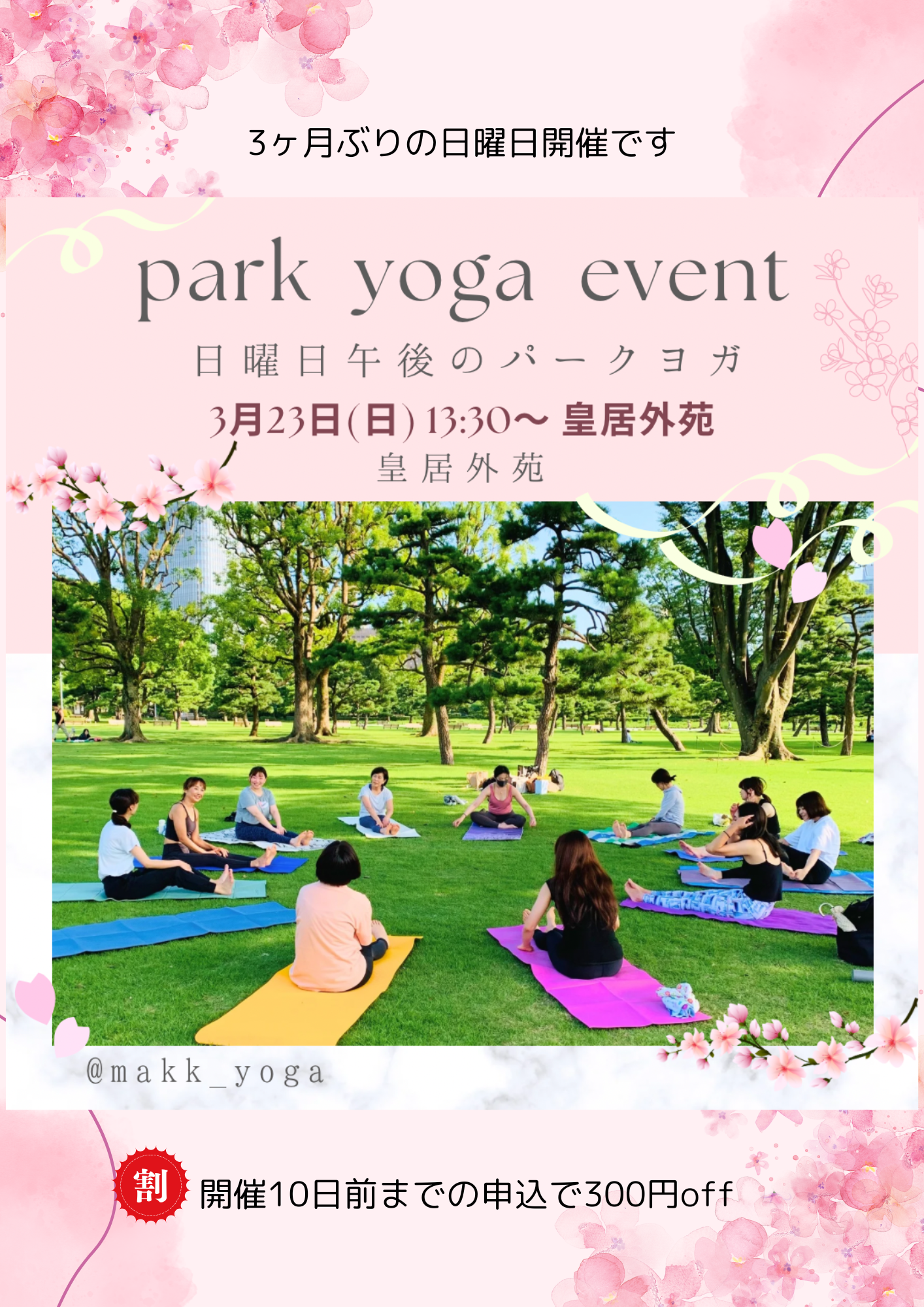 | イベント名 | : | 皇居外苑・日曜日午後のパークヨガ |