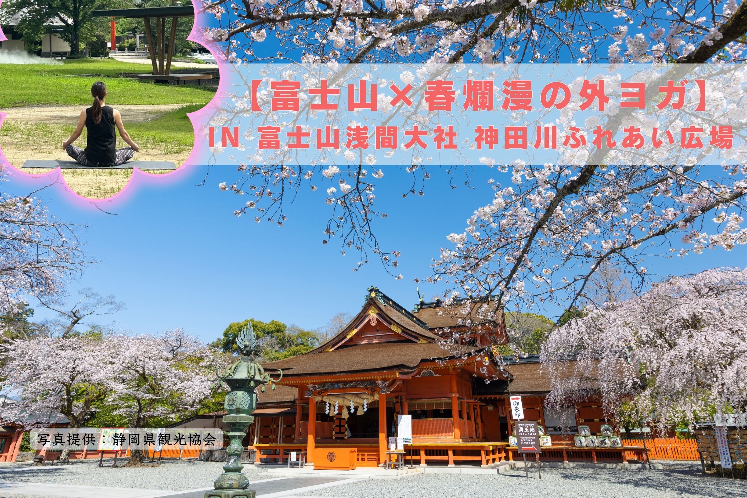 | イベント名 | : | 【富士山×春爛漫の外ヨガ】美の女神「コノハナサクヤヒメ」のパワーを感じるヨガ体験 in 富士山本宮浅間大社 神田川ふれあい広場 |