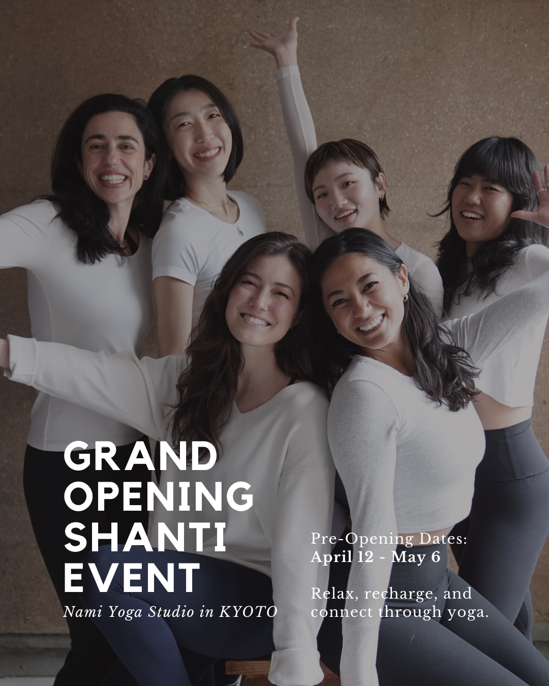 | 実施内容 | : | 京都五条の地域の皆さまや観光で京都を訪れた方が「心身ともにリラックスできる時間を過ごせるように」という思いを込めて、京都にナミヨガスタジオがオープンします。 そこで、5月7日(水)のグランドオープン前にプレオープンとして、4月12日(土)〜5月6日(火)の期間、全クラスを無料にて体験いただける「Nami Yoga Studio in KYOTO Grand Opening Shanti Event」を開催します。 |