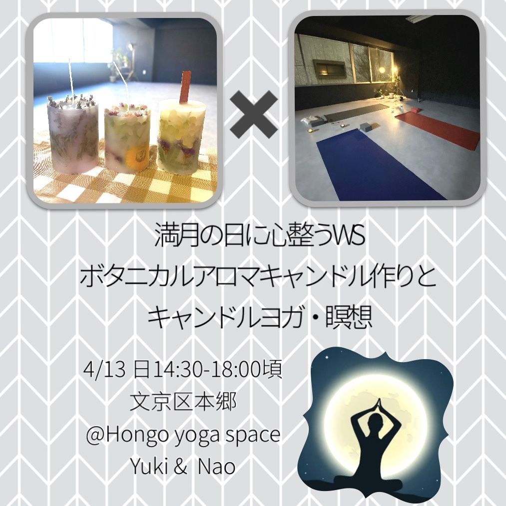 | イベント名 | : | 満月の日に心整うボタニカルアロマキャンドル作りとキャンドルヨガ・瞑想WS |
