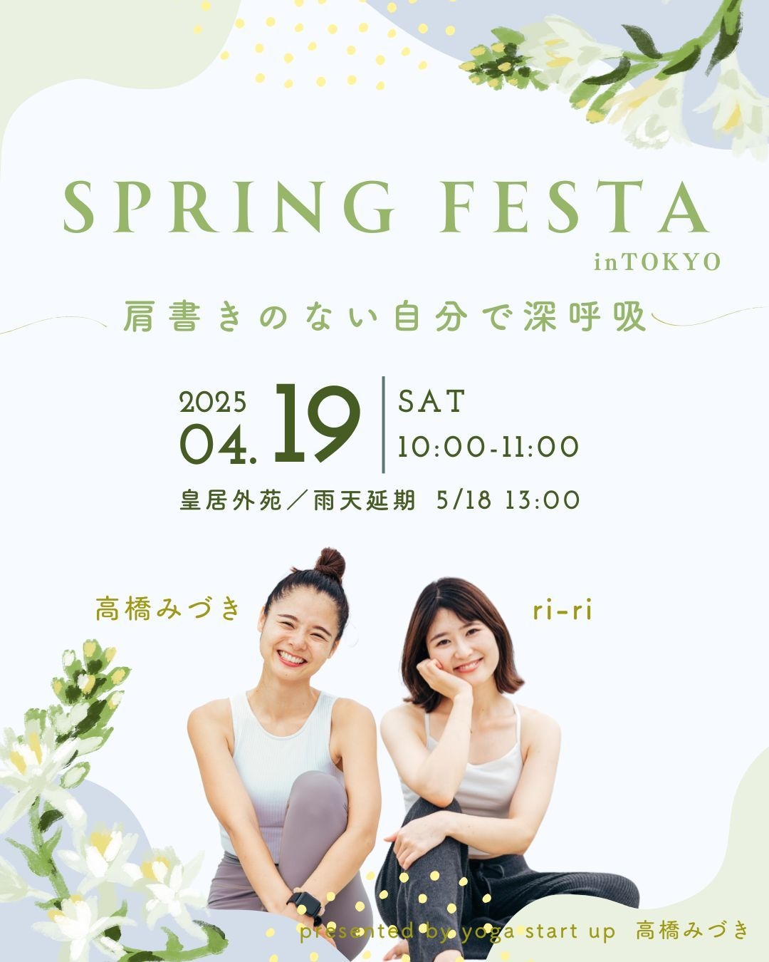 | 実施内容 | : | 4月、新しい季節の始まり。忙しさに追われる毎日だからこそ、ほ 皇居外苑の開放的な空間で、深い呼吸とゆるやかなヨガの中に自分 「仕事で張り詰めた心をゆるめたい」 そんな気持ちがふっと浮かんだら、ここに来れば安心してほっとで  ̄ ̄ ̄ ̄ ̄ ̄ ̄ ̄ 10:05 Spring Flow:高橋みづき 10:35 Connecting Yoga:Riri ※本クラスは、女性限定のヨガイベントです。 |