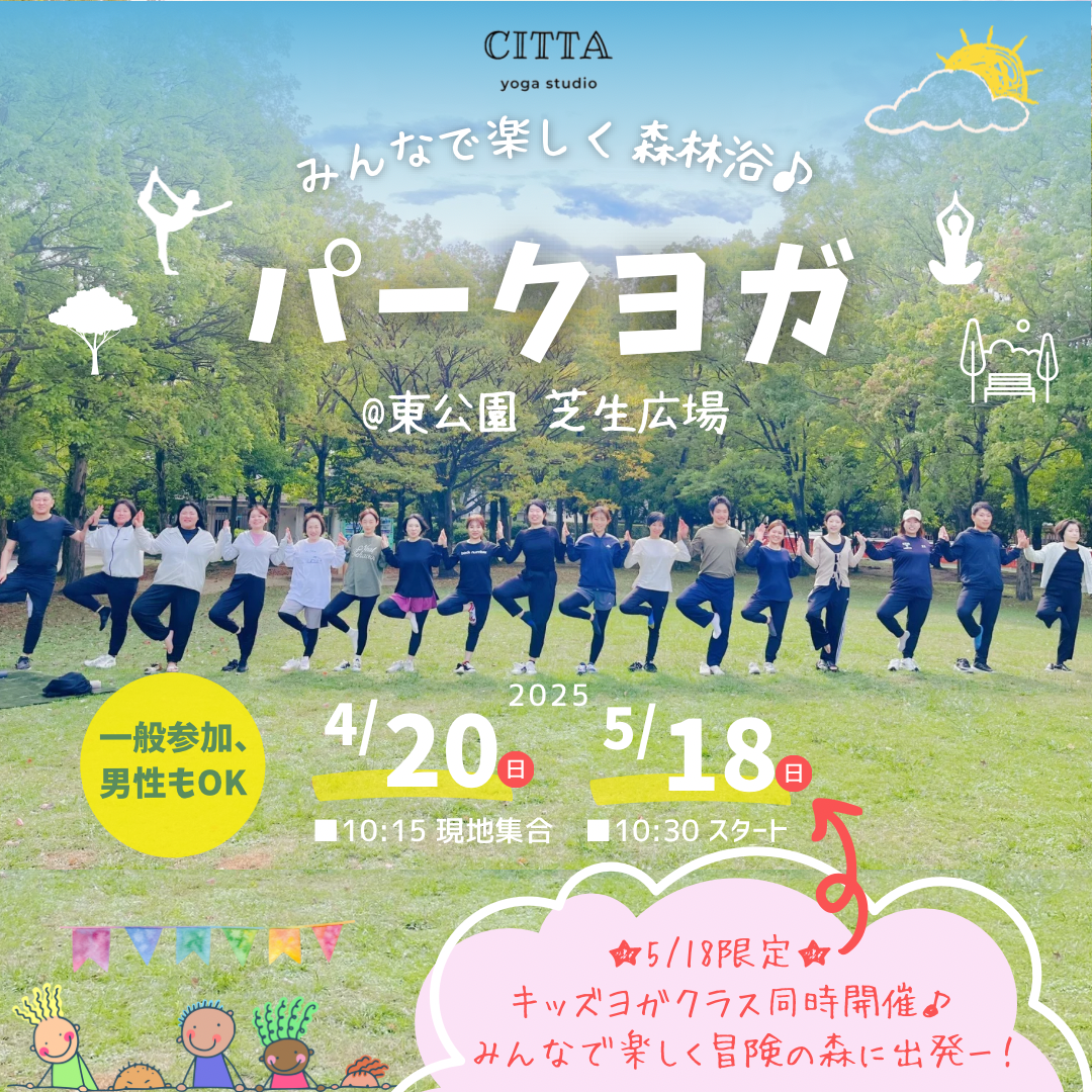 | 実施内容 | : | お友達やご家族さんと一緒にぜひご参加ください♪ 《5/18(日)限定》 ※親子でお申し込みの場合、親御さんは通常クラスへご参加いただきますので、お子さまが自立してレッスン受講可能な場合のみキッズクラスへご参加ください。その他の年齢のお子さまは、通常クラスへ一緒にご参加いただけます。 《持ってくるもの》 ※ ②キッズクラスのみ、ヨガマットはこちらで準備します。 |