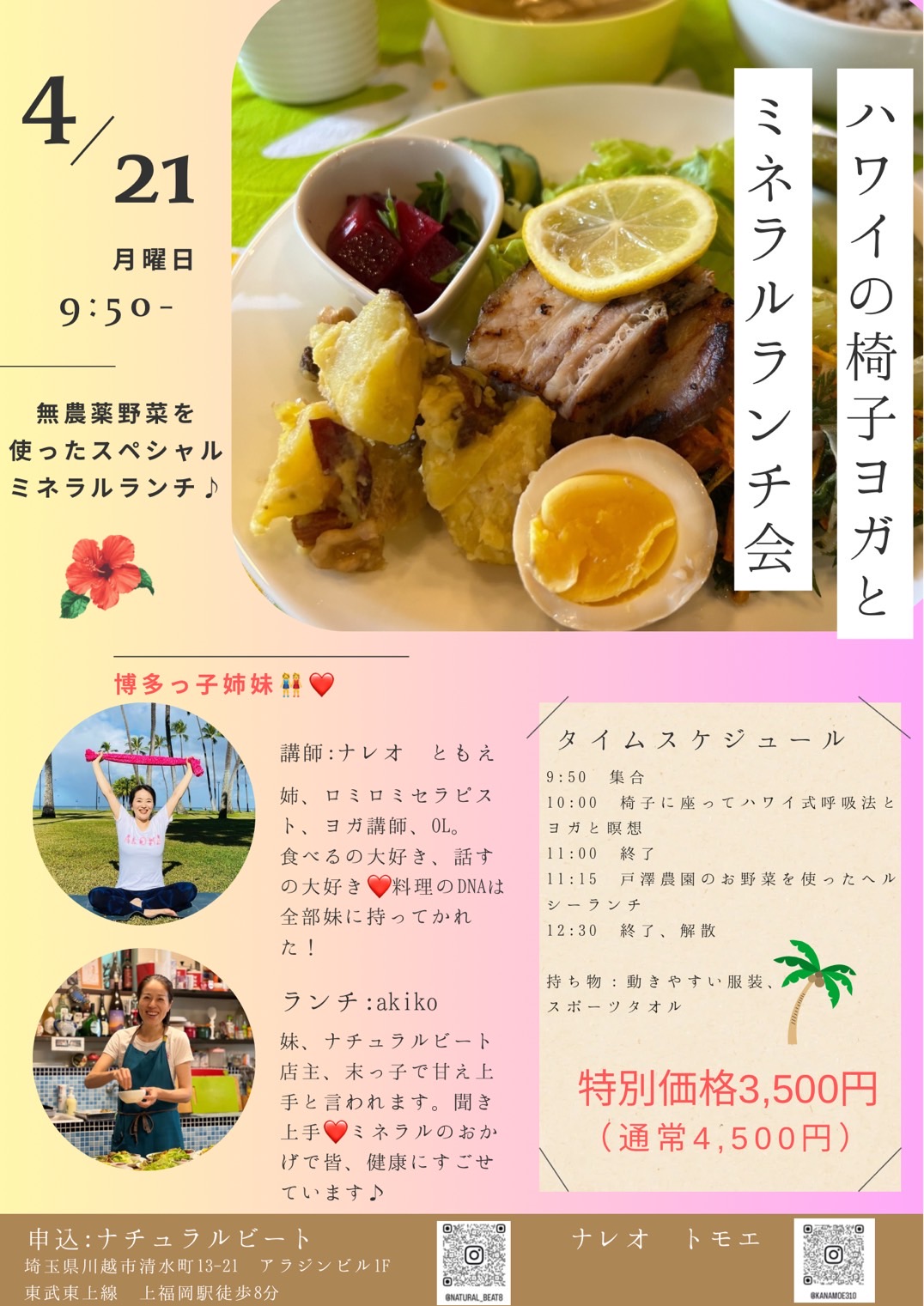 | イベント名 | : | ハワイの椅子ヨガと無農薬野菜たっぷりミネラルランチ会 |