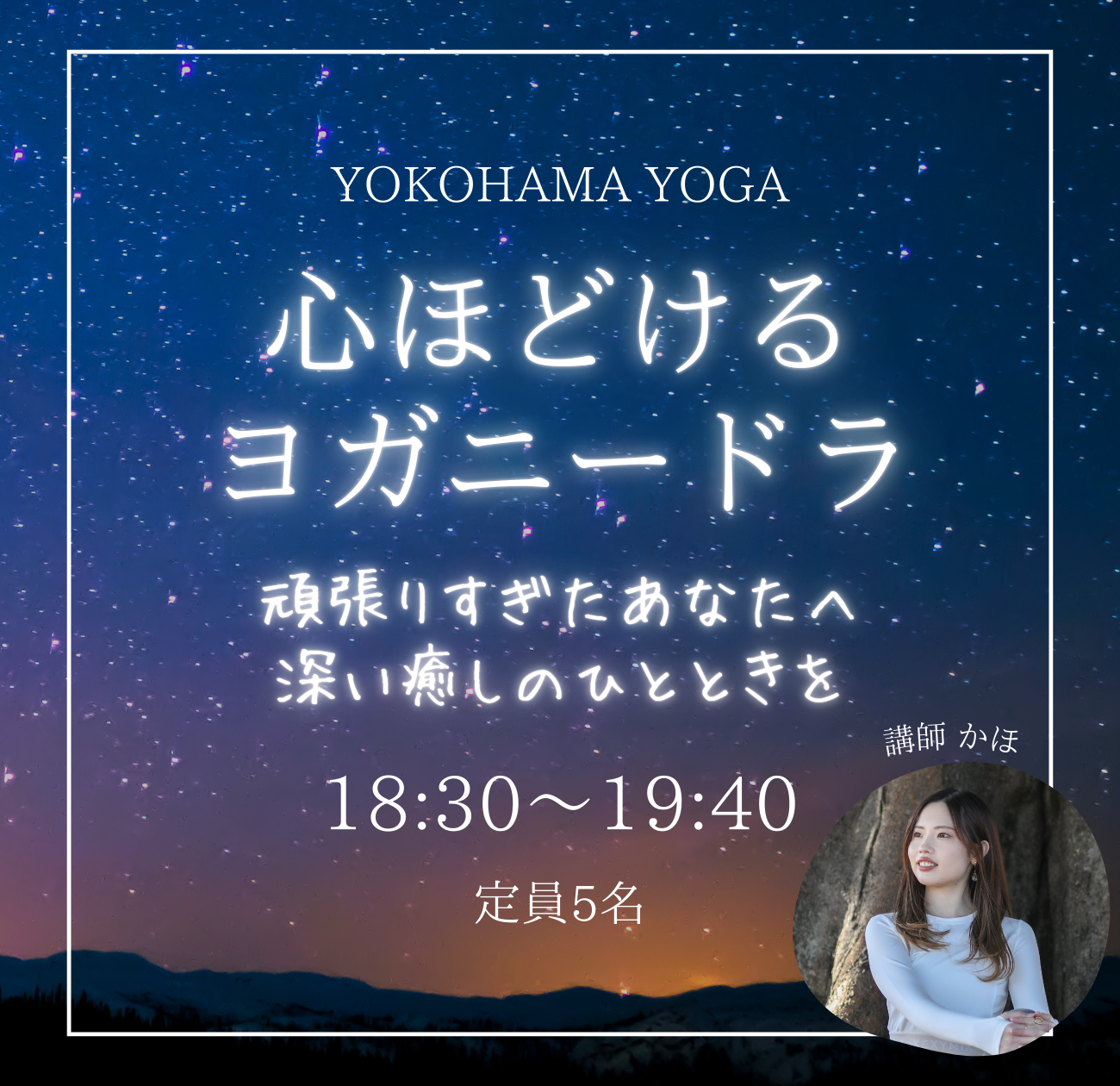 | 実施内容 | : | 前半50分は通常のアーサナ(ポーズ)を行うリラックスヨガのあと、 GW中の方も多い静かな夜、 【ヨガニードラとは?】 仰向けのシャヴァアサナの姿勢で楽にくつろぎ、 緊張しがち、周りに気を遣いがち、細かいことに気にしい、イライラしやすい・・という方(まさに過去の私です)、 【アクセス】「横浜駅」徒歩9分、相鉄本線「平沼橋駅」徒歩7分(場所詳細は予約後にお伝えします) |