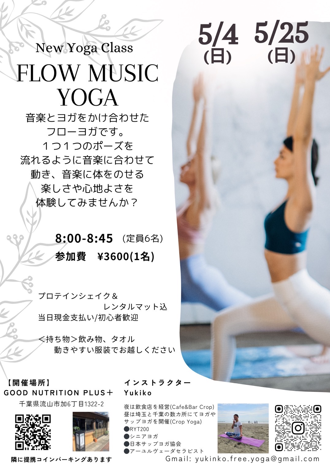 | 参加費 | : | フローミュージックヨガ45分とプロテインシェイク付き¥3600 |