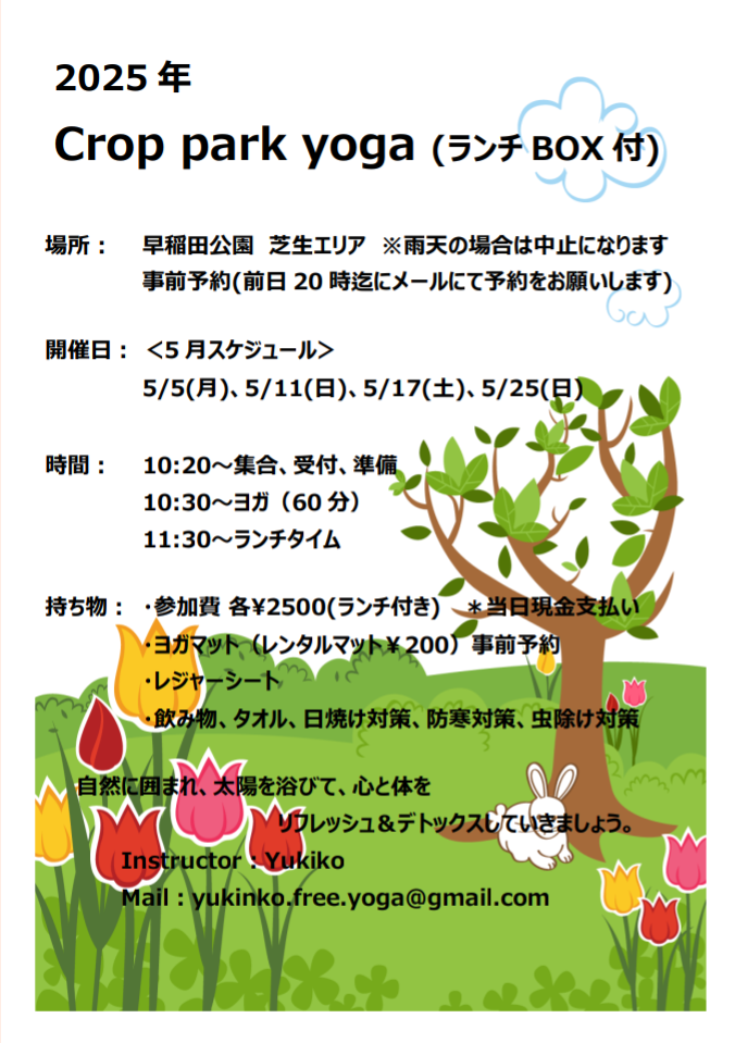 | イベント名 | : | Crop Park Yoga(お弁当付き)in三郷市早稲田公園 |
