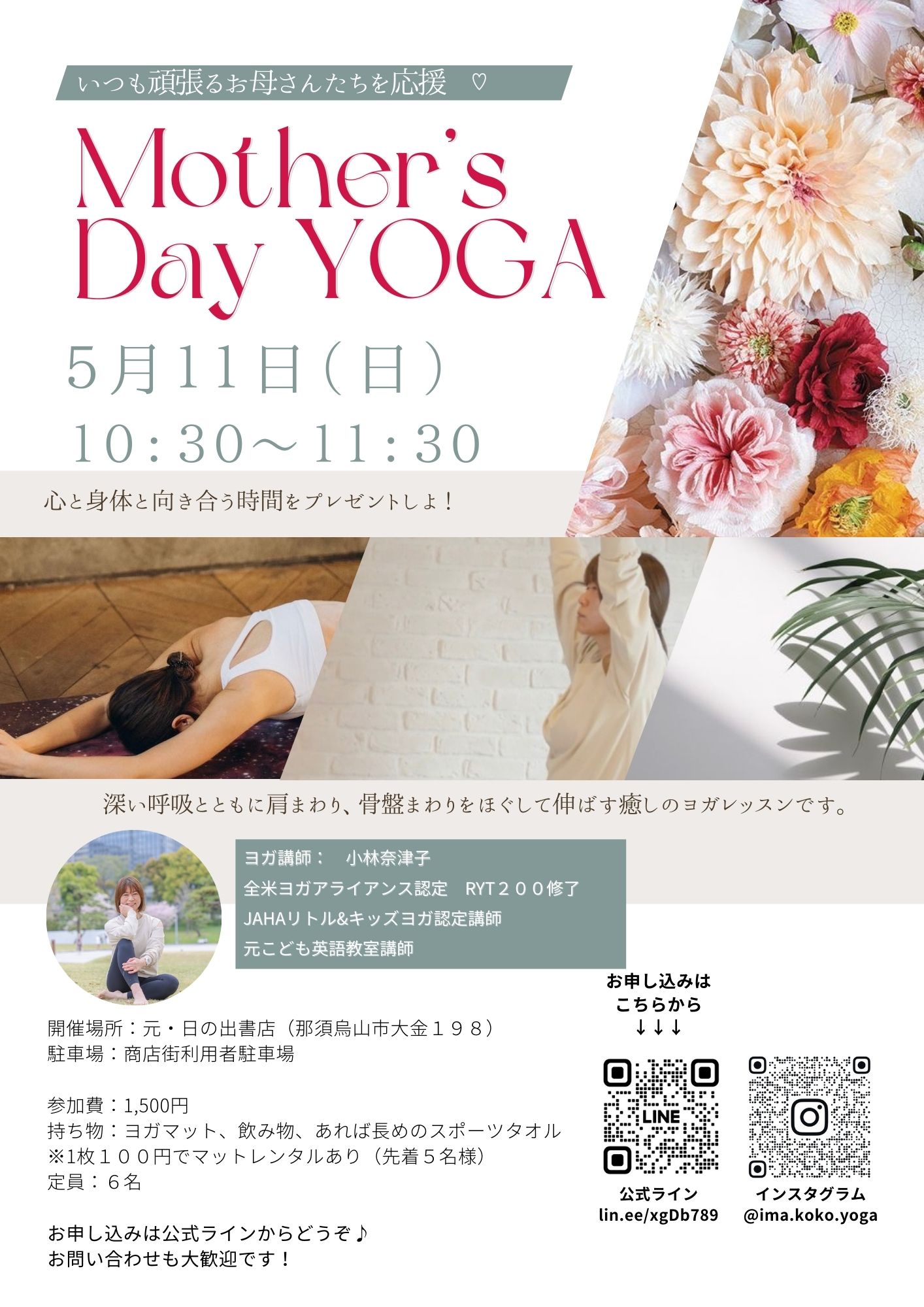 | 実施内容 | : | 全てのお母さんたちを応援! 母の日にお届けするリフレッシュヨガレッスン! 深い呼吸とともに、肩まわり、骨盤まわりをほぐして伸ばすレッスンです。 開催時間 10:30〜11:30 |