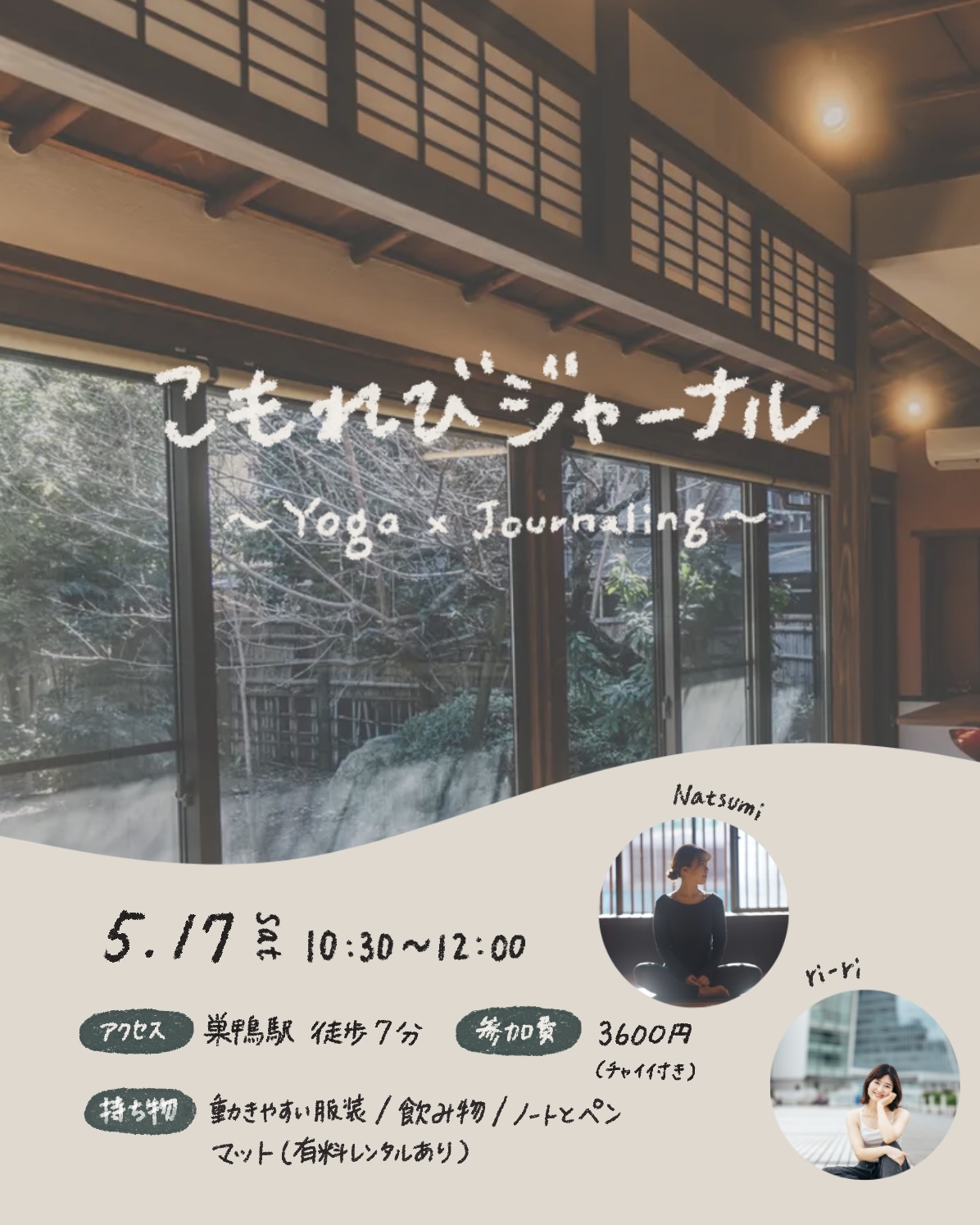 | 実施内容 | : | 都心の隠れ家で過ごす、心と体を整えるひととき。 忙しい日常から少し離れて、静かな古民家でヨガとジャーナリングを体験してみませんか? ヨガで心と体をゆるめた後、自分自身の内側にそっと目を向ける時間。 ここでの時間が、あなたにとって新しい一歩のきっかけになれば嬉しいです! 【スケジュール】 【こんな人におすすめ!】 |