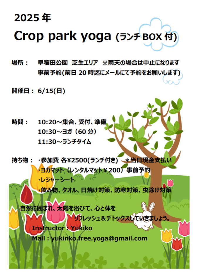 | イベント名 | : | Crop Park Yoga(ランチBOX付き)in三郷市早稲田公園 |