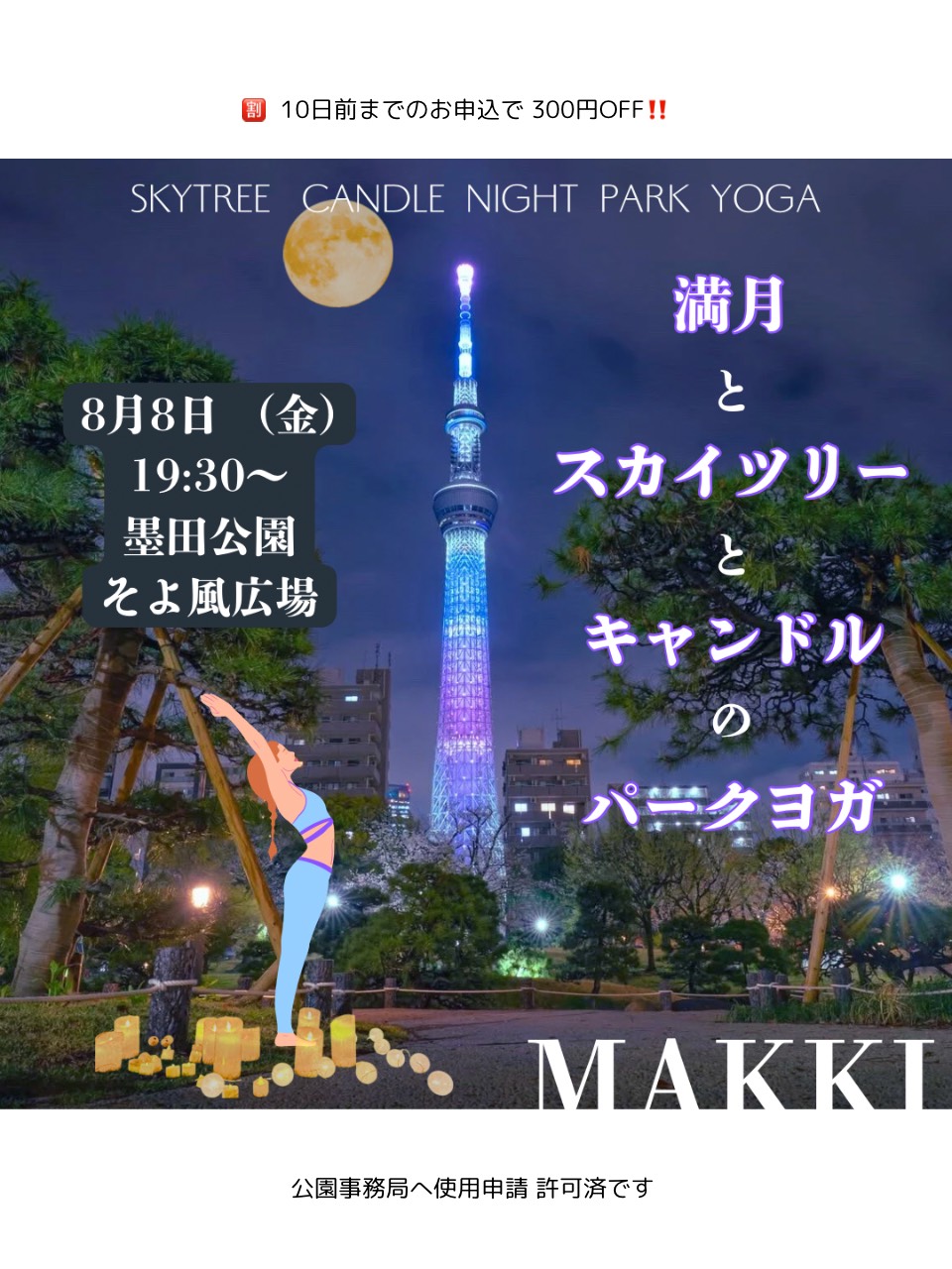 | 実施内容 | : | 大人気のキャンドルナイトパークヨガが 場所を変えて さらに美しいスカイツリーの夜景と一緒にヨガを楽しめる事になりました。 今回は〇満月の日にヨガをします もしかしたら満月とスカイツリーのコラボの夜景を楽しめます 8月8日 (金) 19:30~ ★墨田公園パークセンター(事務局)へ許可申請、公園使用料支払い済みですので、公園許可済みのイベントとなっておりますのでご安心してご参加頂けます。 満月は私たちの心理状態、体調に影響を与えます。 通常価格 3000円ですが 季節の変わり目は、天候急変も、ございます開催につきましては前日メールと開催2時間前にメール致します 柔軟性を高めるアーサナや解し、後半はしっかりと動いて、最後のシャバアーサナの時間を長めにとって 体を労る時間を作ります。 スカイツリーの夜景が美しくきらめく墨田公園で、キャンドルナイトパークヨガを開催しみましょう🕯✨ |