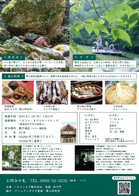 | 実施内容 | : | 愛媛県松山市から車で約一時間半。 標高1,000mである小田深山の気圧は、 ここ小田深山では、山や海が繋がり、あらゆる生命が環っていることを実感できる。 隠れた小田深山の大自然の魅力をご案内。 神秘的なエネルギーと涼しい避暑空間で、 講師は、松山市で『アシュタンガヨガ愛媛』を主宰する森 樹。 食は、小田の地元食材を中心に、 夜は、地元の郷土料理を味わいながら、 ✴︎ヨガが初めての方も大歓迎です。 ✴︎お子様とやご家族でご参加いただくことも可能です。 ※ご家族での参加については一度お問い合わせください。 ※天候や状況により、内容は変更になる場合があります。 【宿泊場所】 ※宿泊はテントなどをご持参いただく必要はございません。 【ご予約】 |