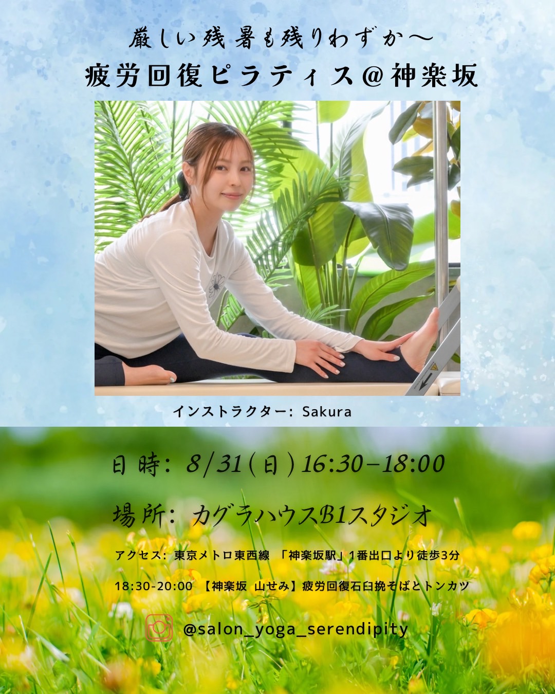 | 実施内容 | : | 【疲労回復】にフォーカスしたピラティスレッスン。呼吸を意識しながらゆっくりと体を動かすことで、血行促進やリラックス効果を高め、疲労物質の排出を促します。また、体幹を鍛えることで姿勢が改善され、体の歪みが矯正されるため、疲労の原因となる体の負担を軽減できます。レッスン後は希望者先着6名でお洒落な【神楽坂 山せみ】にてお蕎麦会。 SAKURA先生よりメッセージ 8/31(日) Time Schedule 18:30~ 先着6名で蕎麦の会(※Sakura先生と一緒に頂きます) 【神楽坂 山せみ】を予約しております。看板の蕎麦は、国産石臼挽のそば粉の香りと食感が際立ちます。低温で仕上げのとんかつ、出汁のきいた鴨鍋など。飲食代は約@5,000円位になります。割り勘となりますので参加を希望される方は□先着6名蕎麦会参加チケットもお申込み下さい。 持ち物 |