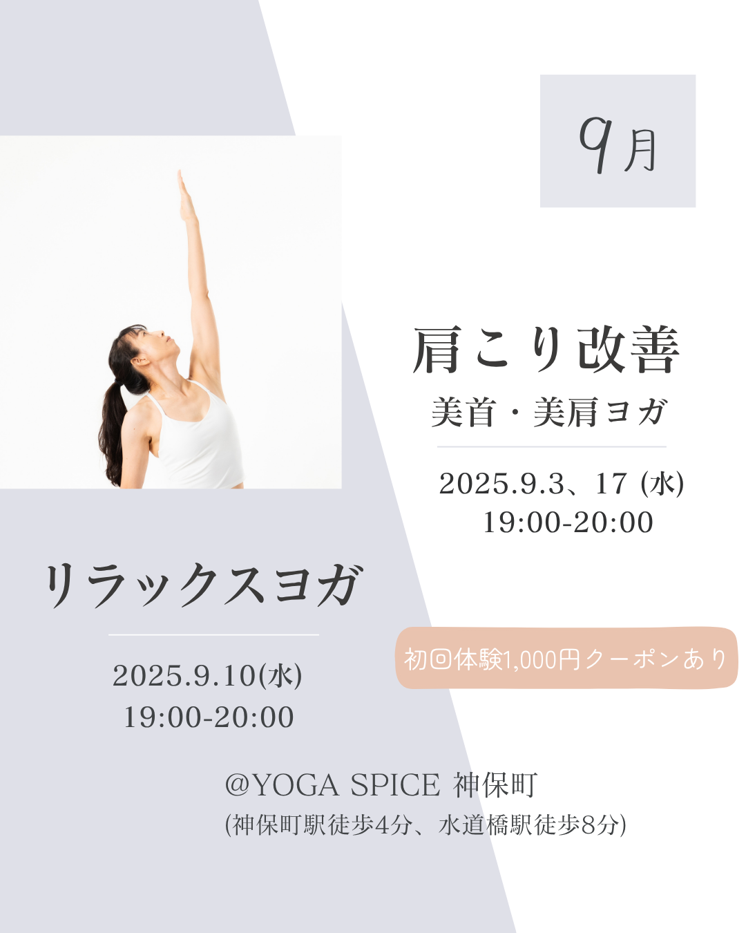 | 実施内容 | : | ①肩こり改善ヨガ ②リラックスヨガ 初めての方には、体を観ながら丁寧にポーズを導きます ★初回体験1,000円クーポンあります! お待ちしています❀ |