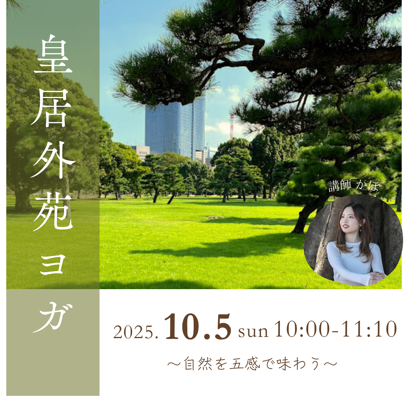 | 実施内容 | : | 皇居外苑の広々とした芝生の上で、 「自然を五感で味わう」というテーマで、 視覚(木々や芝生の緑)、聴覚(風の音、鳥の声)、触覚(芝生の感触、太陽の温かさ)など、 呼吸に動きを合わせて動いていく中で、 【持ち物】ヨガマット(レンタルされる方以外)、動きやすい服装、お飲み物、タオル(汚れても問題のないもの)、帽子やサングラス(紫外線が気になる方はおすすめ) |