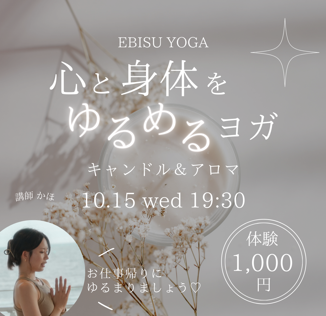 | イベント名 | : | 心と身体をゆるめるヨガ 〜キャンドル&アロマ〜 @恵比寿 |