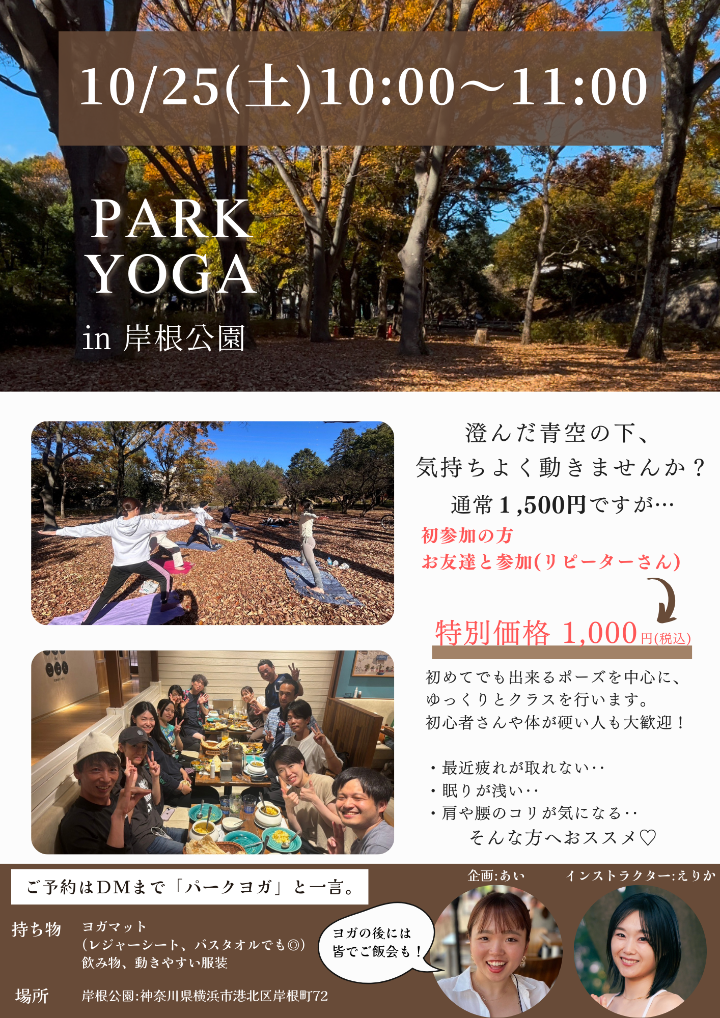 | 実施内容 | : | 秋風が心地よい10月にパークヨガを行います。 初心者大歓迎 ヨガの後は近くのカレー屋さんでランチ会も行います。お時間可能な方は是非こちらもご参加ください。