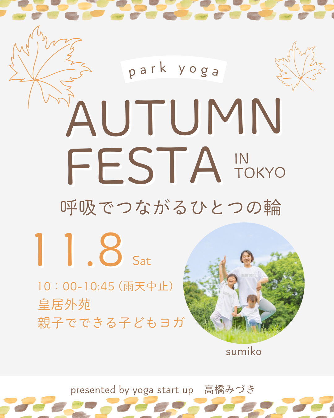 | イベント名 | : | Autumn Festa in TOKYO 呼吸で繋がるひとつの輪 親子でできるパークヨガ |
