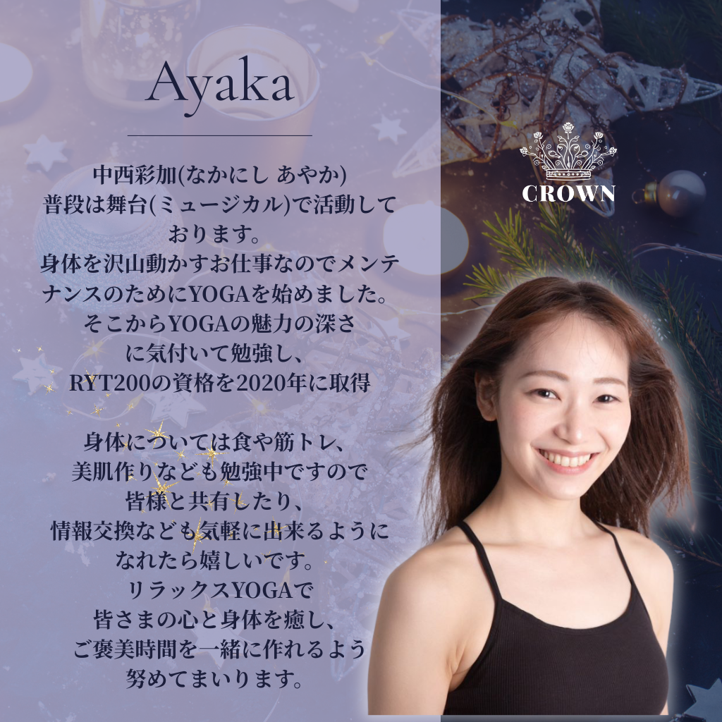 Ayaka 私が担当させていただく陰ヨガではその日に参加してくださった方の好みや体調に合わせてアロマを使いながら無理のないポーズを1つ1つ丁寧に行っていきます。 Instagram:@ayaka.n006 |
