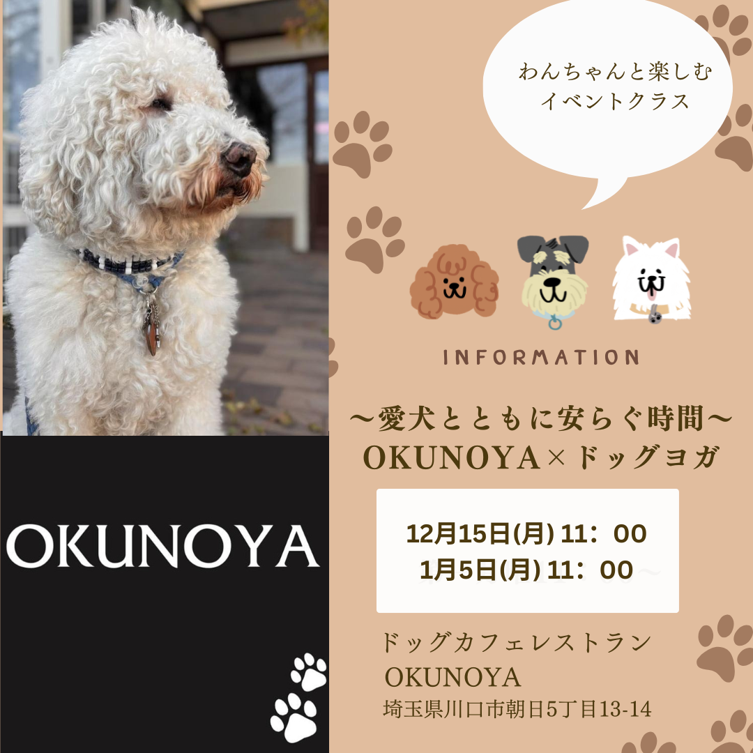 | 実施内容 | : | \OKUNOYA×わんちゃん連れOKヨガ/ ~わんことともに安らぐ時間~ 川口市のドッグカフェレストランOKUNOYAさんにて 営業前のお店を貸切しますので、のびのびとご参加いただけます。 わんちゃんと一緒にヨガがしたい方 レンタルマット無料・飼い主さまのお水はこちらでご用意しておりますので身軽でお越しください♪ ヨガの後はOKUNOYAさんの美味しいランチ! |