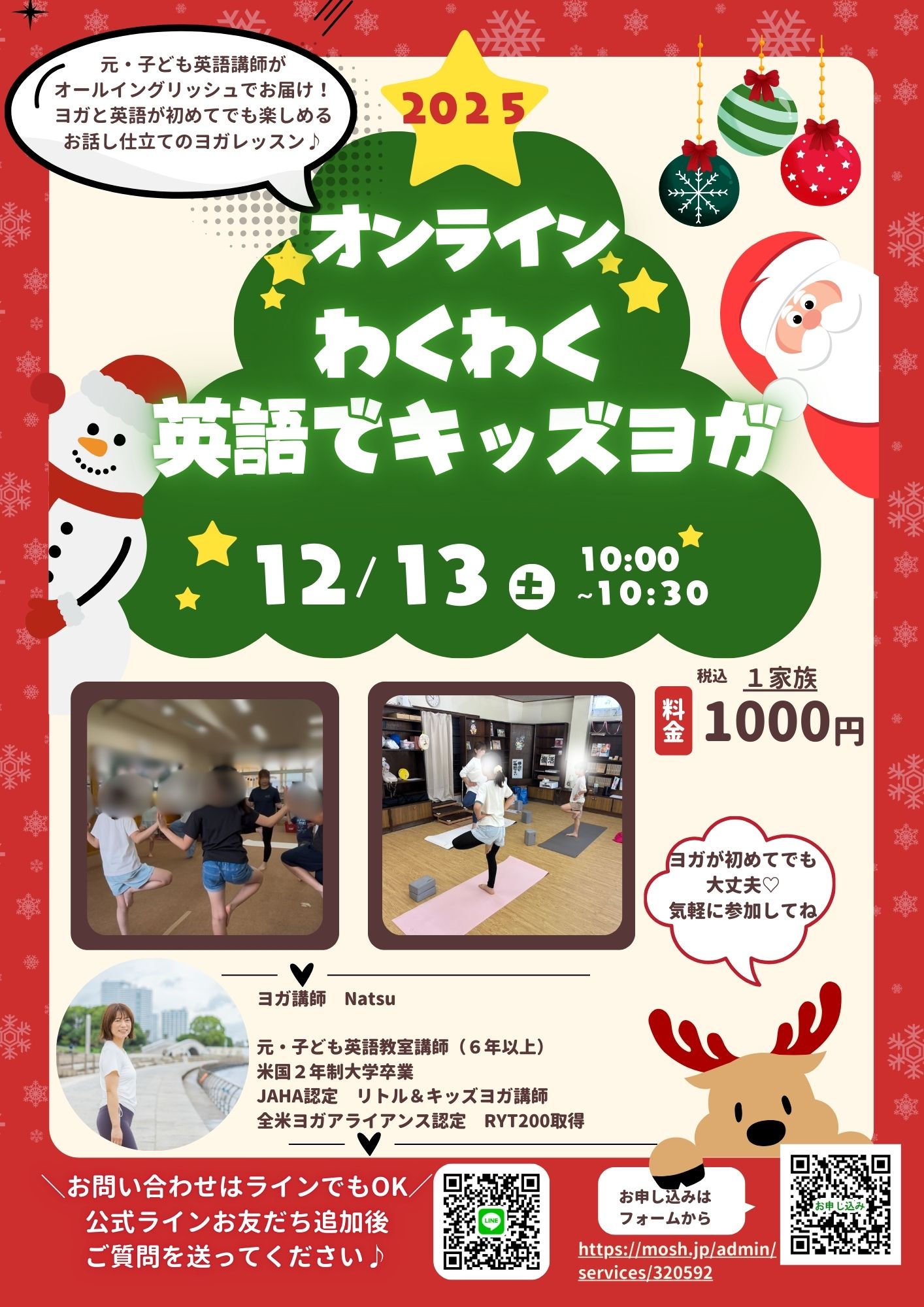 | 実施内容 | : | 元・子ども英語講師がお届け♪ テーマは「クリスマス」 今回のオンラインヨガのテーマはクリスマス♪ お子様たちの馴染みのある動物や乗り物、食べ物にちなんだヨガポーズを通して、普段使わない筋肉を動かしたり、呼吸に意識を向け楽しく動いていくレッスンです♪ 英語は身体を動かしながらの方が習得しやすく、「楽しい」などの感情を味わいながらの方が習得しやすいと言われており、ヨガとの相性が抜群です♡ 講師は6年以上子ども向け英語教室でオールイングリッシュでレッスンをしていた経験があり、英語が初めてのお子様でも安心してご参加いただけます♪ ぜひみんなで一緒に楽しく英語でヨガしましょう♪ ーーーーーーーーーーーーーーーーーーーーーーーーーーー 日時:12月13日(土)10:00〜10:30 対象:4歳から小学校中学年くらいまでのお子様、または親子 金額:1,000円 服装:動きやすい服装(スカート、ジーンズ以外がおすすめ) 用意していただくもの: ヨガマット、お飲み物、タオル たくさんのご参加お待ちしております♪ |