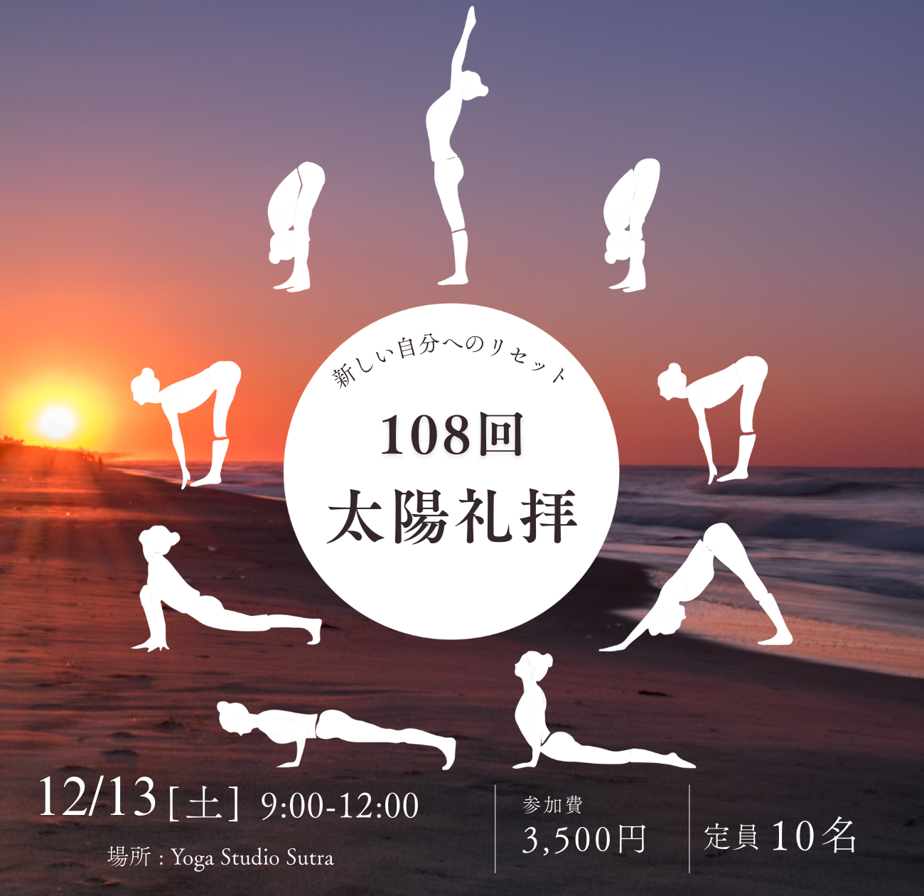 | 実施内容 | : | \年末特別イベント108回太陽礼拝/ 朝の身体をゆっくり目覚めさせ、呼吸と動きを整えてくれる「太陽礼拝」。 ☆9:00~11:30 太陽礼拝セッション ☆11:30~12:00 軽食付きのリラックスタイム 18歳以上の男性・女性どなたでもご参加できます。 |