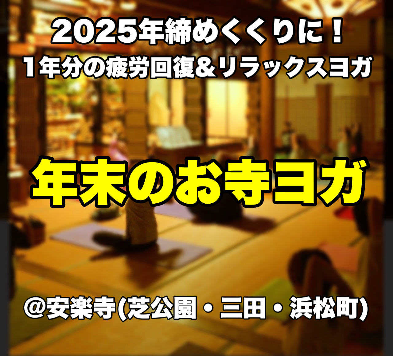 | イベント名 | : | 【東京お寺ヨガ】2025年締めくくりに! 1年分の疲労回復&リラックスヨガ |