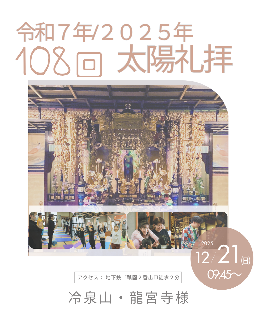 | 実施内容 | : | ⊹ 年末の心と体のリセットに ⊹ —– —– —– —– —– 今年も 龍宮寺 で108回太陽礼拝 —– —– —– —– —– 今年も、博多区冷泉町の歴史あるお寺「龍宮寺」様にて —– —– —– —– —– ⊹ 太陽礼拝は、呼吸と動きを繰り返すことで、 ⊹ 太陽礼拝とは? 「108回すべてできるかな…?」と不安な方も、 ● 同じ空間で、同じ時間を お子様、おじいさま、おばあさまとのご参加も大歓迎です。 |