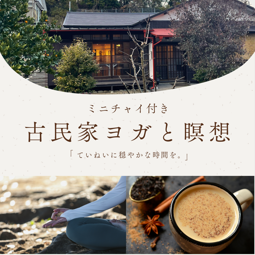 | 実施内容 | : | 静寂に包まれた古民家で、心と体を解きほぐす特別な時間を過ごしましょう。 このクラスでは、ていねいに動いていくヨガと瞑想を通じて、心を落ち着かせ、今この瞬間に意識を向けるマインドフルネスを体験します。 ヨガと瞑想の後には、 スパイス香るあたたかいミニチャイをご用意しています。 今回はいつもの金沢八景の古民家と違う場所をお借りしての開催となりますのでご注意ください! 【持ち物】ヨガマット(レンタルされる方以外)、動きやすい服装、お飲み物、タオル |
