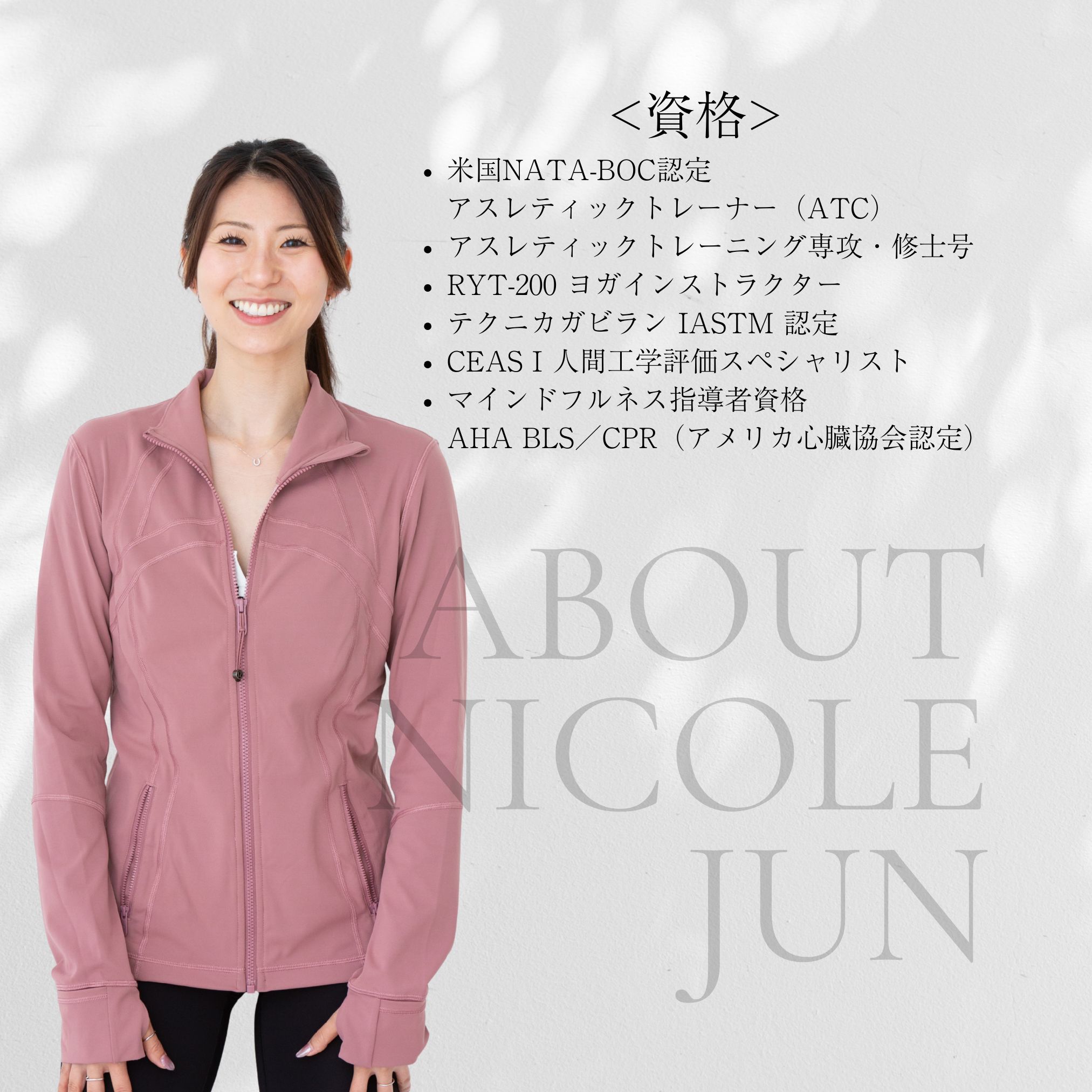 Nicole Jun ニコル純(Nicole Jun) カリフォルニア出身。アメリカ国家資格ATCとしてリハビリテーション、動作評価、姿勢改善を専門に活動し、日本ではパーソナルトレーニングやヨガ指導、企業向けウェルネスプログラムに携わる。 日英バイリンガルでの指導が強みで、「分かりやすく、安全に、無理なく続けられる」ウェルネスを提供している。 |