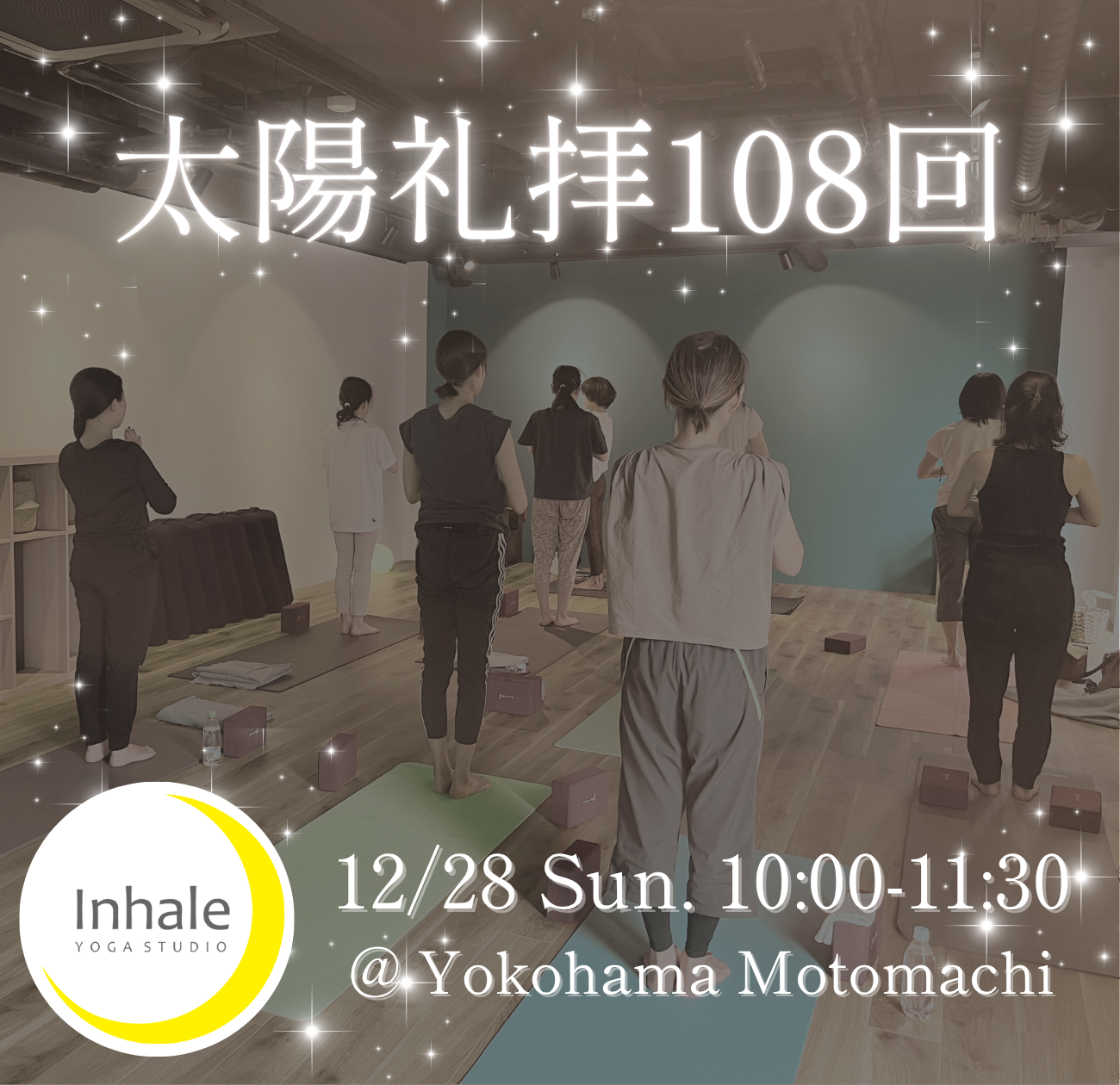 | 実施内容 | : | 「太陽礼拝108回@YOKOHAMA MOTOMACHI」 年末に太陽礼拝を108回行う習わしがあるのをご存知でしょうか? 太陽礼拝は12のポーズをつなげており、 そして、108は煩悩の数と言われており、年末では太陽礼拝を108回行うことで1年の煩悩をひとつづつ消していく 途中でお休みしても良いですし、全部行わなくても問題ありません。 一緒に1年の埃を落として浄化しましょう!! 日時:12月28日(日)10:00~11:30 ご予約は予約サイト↓からお願いします。 |