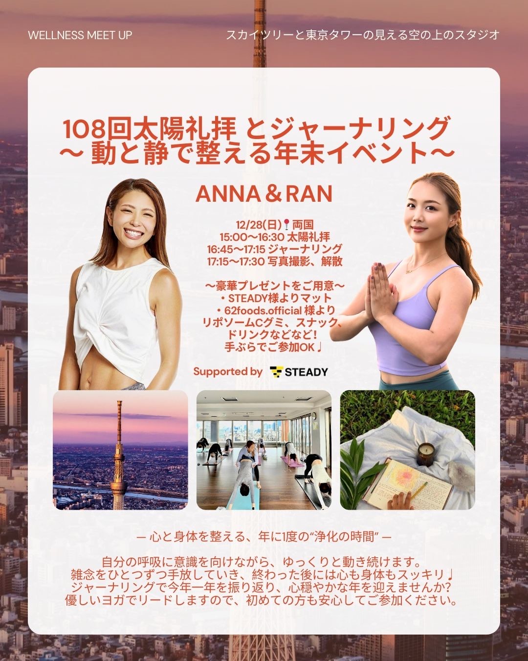 | 実施内容 | : | みなさん、このイベントの季節がやってきました!!! 去年カナダでお休みでしたが、やはりやらないと年を越せない 8年目は、お友達で尊敬する @anna97114 さんとコラボ スカイツリーや東京タワーを望む空の上のスタジオで、心と身体を整える特別な浄化時間にしたいと思います ANNA & RAN がじっくりリードする、年に一度の自分と向き合うビッグイベント ⸻ 今年の疲れを手放し、軽やかに新年へ 自分の呼吸に意識を向けながら、ゆっくりと動いていく90分 静かに自分と向き合う年末の浄化時間、一緒に過ごしませんか? ⸻ 【108回太陽礼拝】 108回までの間に、様々な想いが頭に浮かぶと思います。 ⸻ 参加希望の方はDMまたはプロフィールのリンクからお申し込みください @wellnessmeetup |