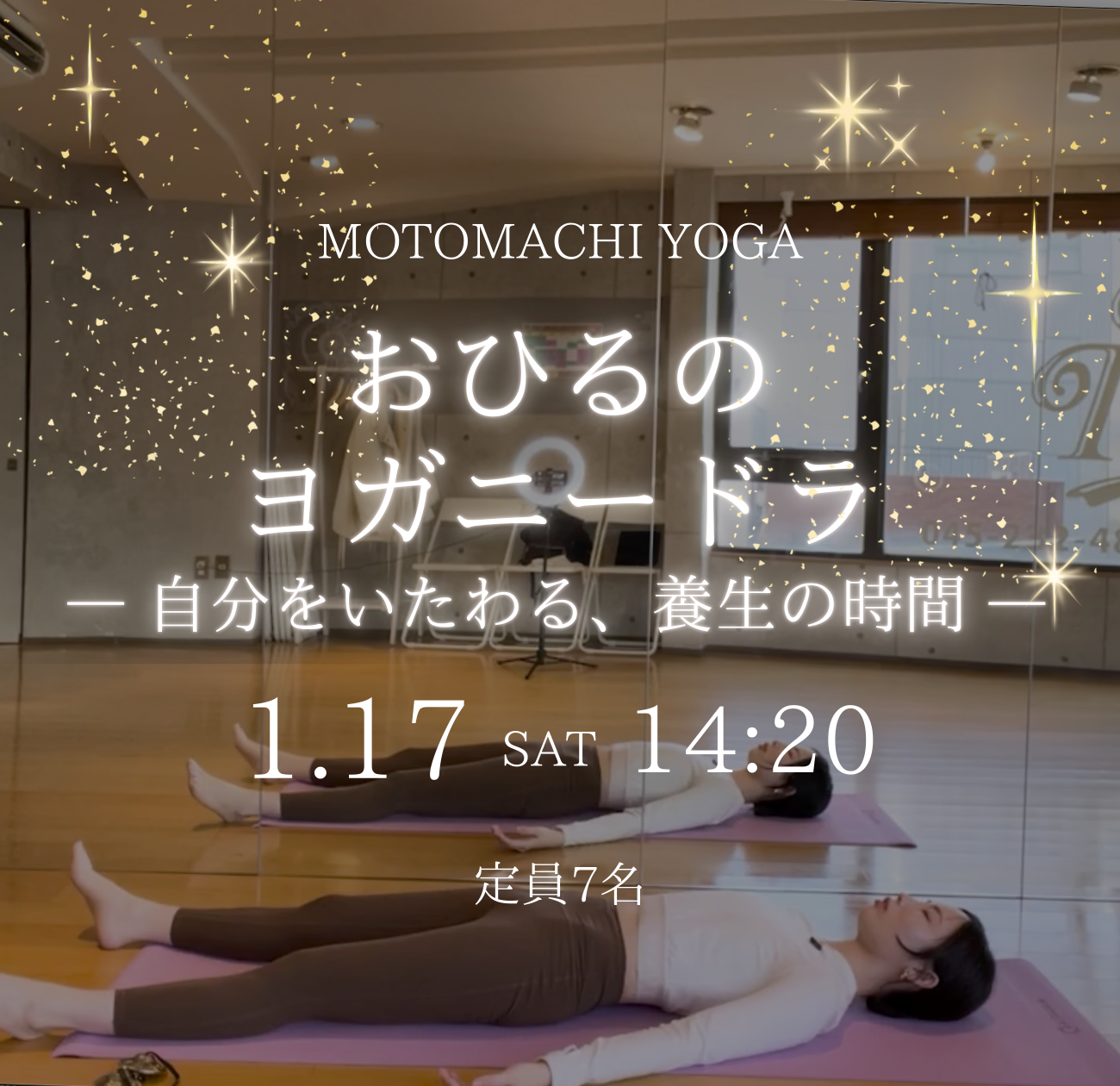 | 実施内容 | : | 寒さで身体がこわばり、年明けの疲れがじわりと表れやすい1月。 軽く身体をゆるめたあと、横になったまま声のガイドに身を委ね、深い眠りと覚醒のあいだにいるような、深いリラクゼーション状態へと導きます。心と身体を芯から休ませてくれるはず。 冬の静かなエネルギーに寄り添いながら、内側に余白と温かさを取り戻すひとときをお過ごしください。 【持ち物】ヨガマット(レンタルされる方以外)、動きやすい服装、お飲み物、タオル、ブランケットや羽織もの |