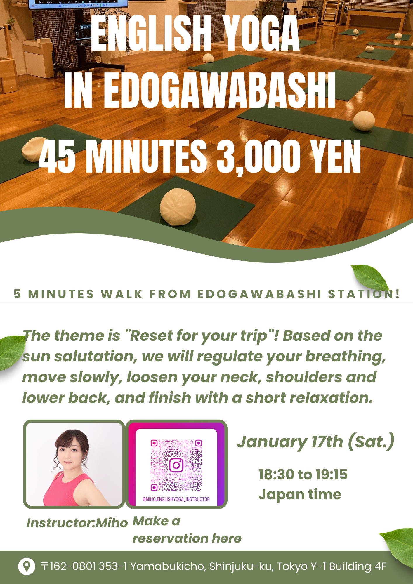 | 実施内容 | : | 英語ヨガ@江戸川橋 やさしい英語ガイド+日本語サポート/少人数/旅行者&初心者歓迎 ●開催日・時間● ●クラス● ガイド:英語メイン+日本語サポート 難易度:ゆるめ(初心者OK/リラックス重視) 内容例:呼吸 → 首肩リリース → 背面ゆるめ → やさしい太陽礼拝風 → 休息 ●対象● 旅の疲れ・時差ボケをやさしく整えたい方 英語に触れながら、静かにリラックスしたい方 ヨガ初心者/ブランクありの方も歓迎 ●場所● 江戸川橋(神楽坂エリア)のスタジオ ●持ち物・服装● 動きやすい服(更衣室あります) ウォーターサーバーはありますが、100円かかります。 タオル ※ヨガマットの用意はあります。 ●安全について● 体調が優れない場合・痛みがある場合は無理をしない/事前にお知らせください。 妊娠中の方は主治医に確認のうえ、無理のない範囲でご参加ください。 香りに敏感な方もいるため強い香水はご遠慮ください。 キャンセルポリシー 開催48時間前まで:全額返金 24時間以内:返金不可(お席の譲渡は可)