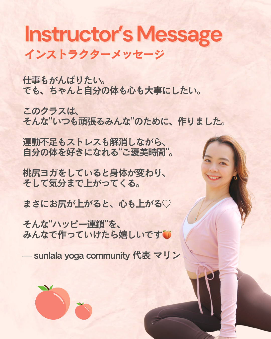 | 実施内容 | : | 〜桃尻ヨガ3ヶ月チャレンジ〜 「桃尻」づくしの3ヶ月チャレンジがNew Start! ヒップアップに特化したヨガで、理想のラインを作ろう! 「筋肉痛になった!」そんな声が続出した人気クラスが、パワーアップして帰ってきました! 「桃尻」を軸に、月ごとにテーマを変えて、 美尻+全身バランスを整えるスペシャルシリーズです。 ●第3弾 “桃尻×燃焼‼︎” ●チャレンジスケジュール ■スケジュール ■開催場所 ■持ち物 ■キャンセルポリシー |