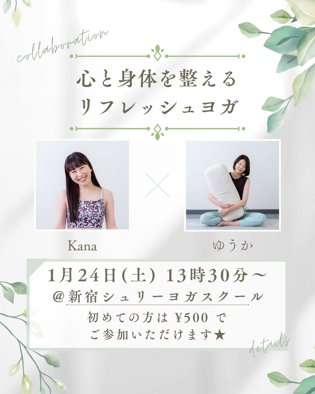 | 実施内容 | : | 心と身体を整えるリフレッシュヨガ 1月24日(土) 新宿シュリーヨガスクールにて開催 |