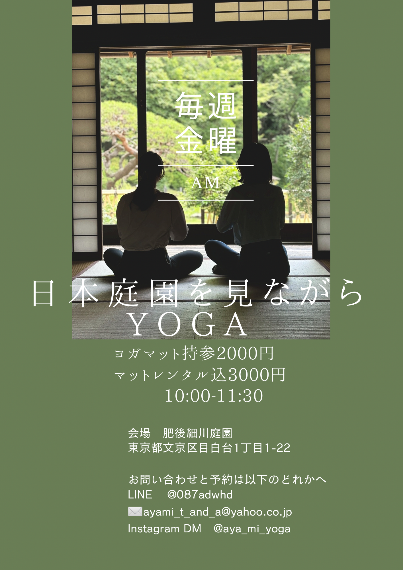 | 申込方法 | : | ①Instagram @aya_mi_yoga へDM ②公式LINE https://lin.ee/Z0z3C4B ③mail ayami_t_and_a@yahoo.co.jp いずれかに【お名前とヨガマット持参orレンタル】とご連絡ください! ▷更衣室なし(トイレあり) |
