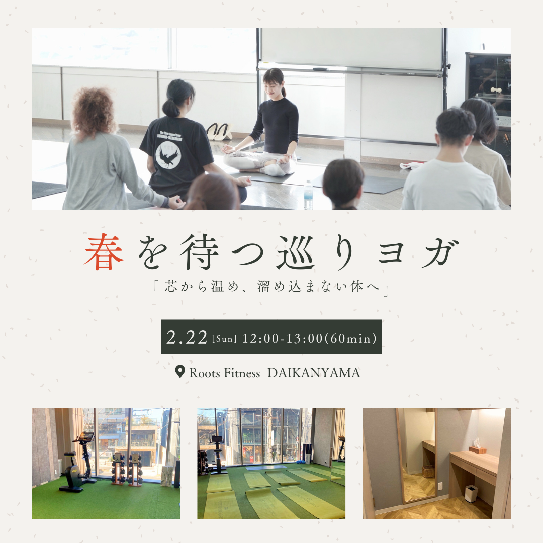| 実施内容 | : | 朝方や夜はまだ寒さが残る季節。 このクラスでは、関節や筋肉をやさしく丁寧に動かしながら、内側 芯から温まる心地よさを味わいながら、不要なものを手放し、軽や \ 会場:Roots Fitness DAIKANYAMA / 【当日スケジュール】 【お持ち物】 |
