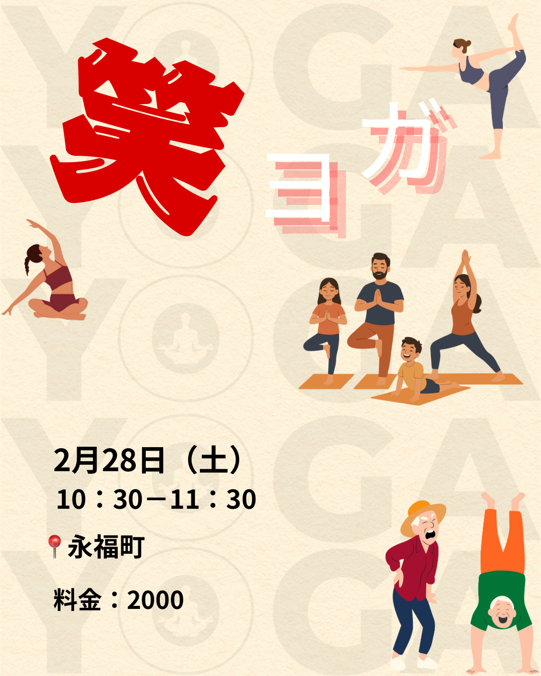 | 実施内容 | : | 笑って、動いて、つながる時間. 今回は「笑い」をテーマにしたヨガイベントを開催します! ペアヨガやチャレンジポーズ、 ヨガが初めてでも大丈夫◎ 「最近あんまり笑ってないな〜」 —- 当日スケジュール —- 10:15 会場オープン 10:30 レッスンスタート 11:30 レッスン終了 12:00 終了 ※女性限定のクラスになります。 |