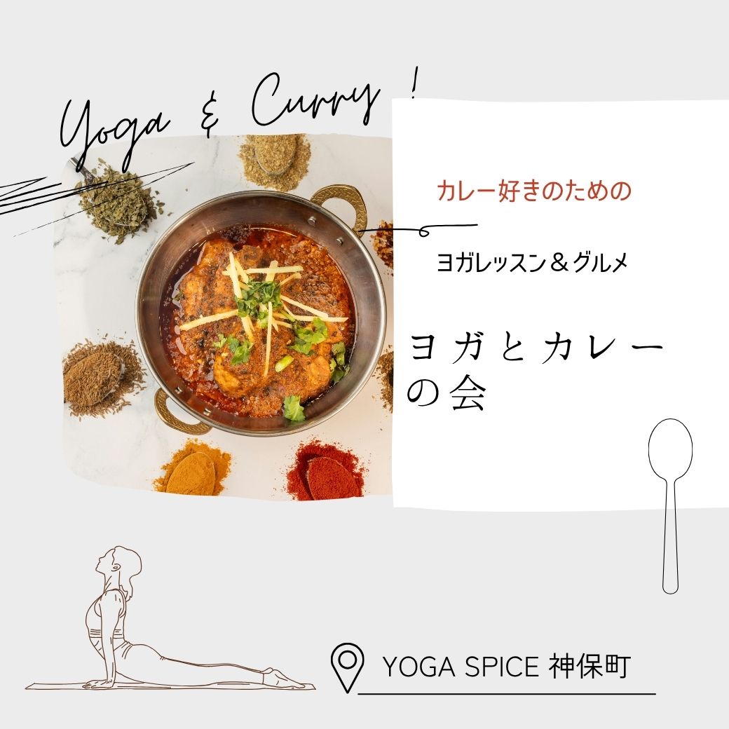 | 実施内容 | : | ヨガとカレーの会 その時々のテーマに沿ったヨガレッスンののち、カレーを食べに行 身体をケアし、心をゆるめ、ととのった身体にスパイスが満たされ 初めての方、お一人での参加も大歓迎。 ~イベント概要~ 場所:YOGA SPICE 神保町 持ち物:動きやすい服装、汗を拭くタオル、お水 参加費:3,500円 当日現金払い |