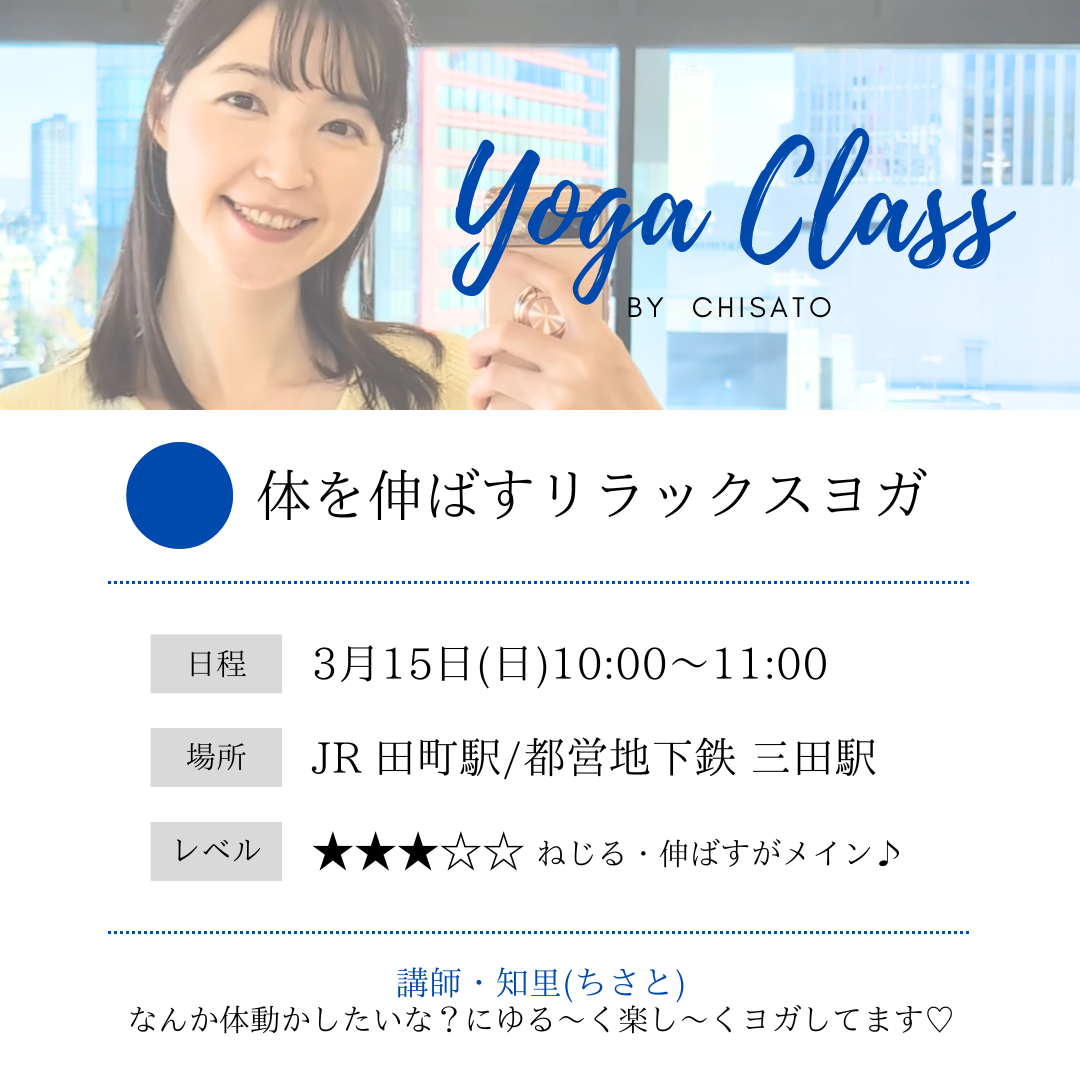 | 実施内容 | : | \体を伸ばすリラックスヨガ/ 体がカチコチで体をほぐしたい…! 基本的にキープポーズやチャレンジポーズは少なめ。 ヨガ初心者さん、運動嫌いさん、身体の硬い方、大歓迎! |