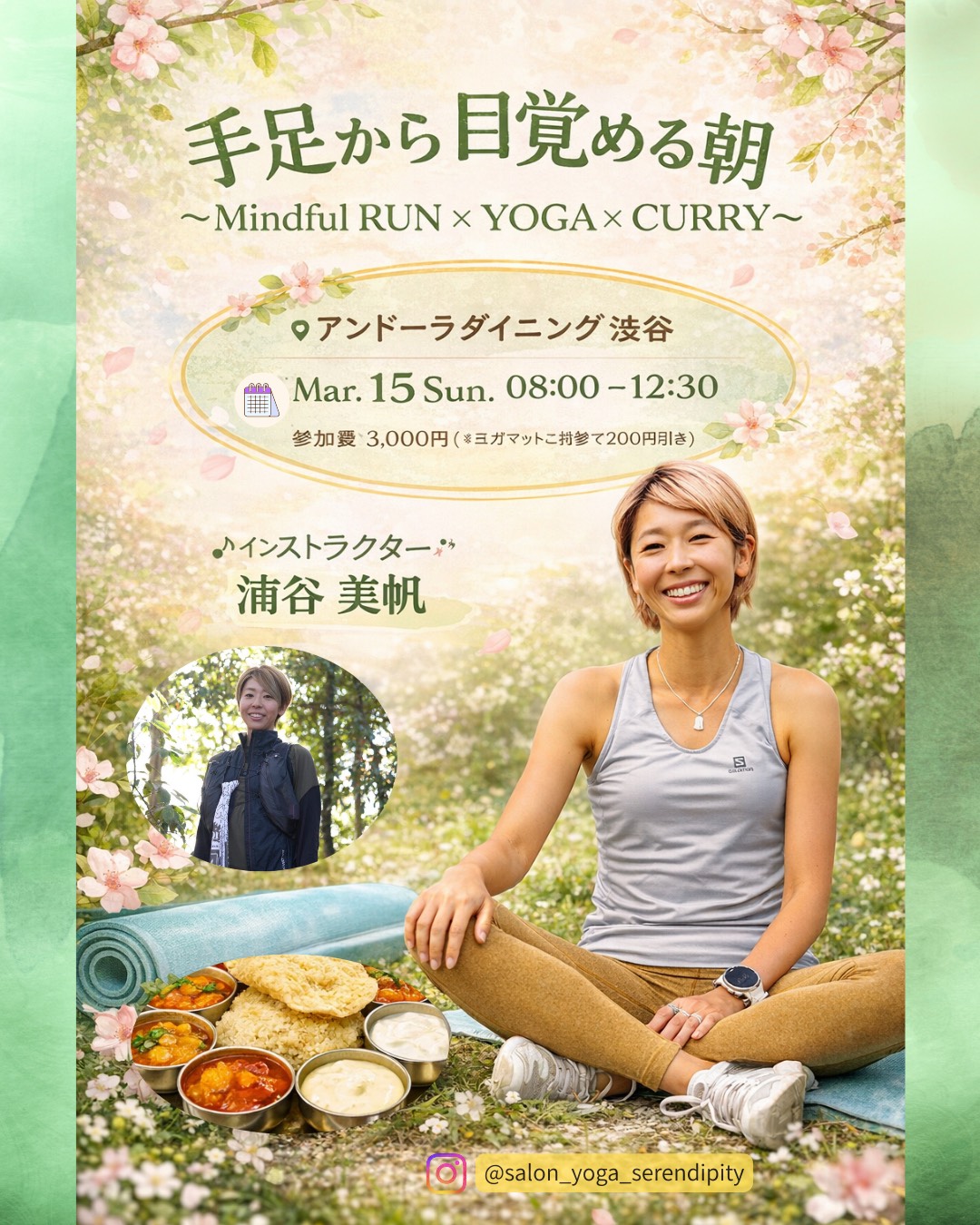 | 実施内容 | : | 【コンセプト】スロージョグで体を目覚めさせて、 ヨガのみのご参加も大歓迎です! レッスンの後は、本格的な南インドカレーやビリヤニなど、 浦谷美帆先生よりメッセージ(レッスン内容); Time Schedule 集合場所 東京都渋谷区宇田川町36 ノア渋谷10階 1001号室 08:20 代々木公園ケヤキ並木入口集合(RuntripBASE YOYOGIPARKを利用する方と合流) 9:45 アンドーラダイニング渋谷集合(ヨガからご参加の方はこの時間にお越しください)・集金 持ち物 |