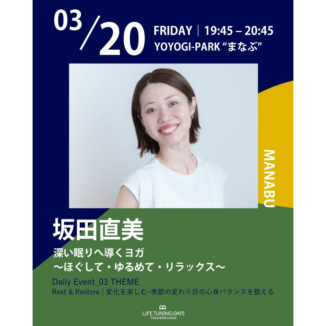 | イベント名 | : | 深い眠りへ導くヨガ~ほぐして・ゆるめて・リラックス~ |