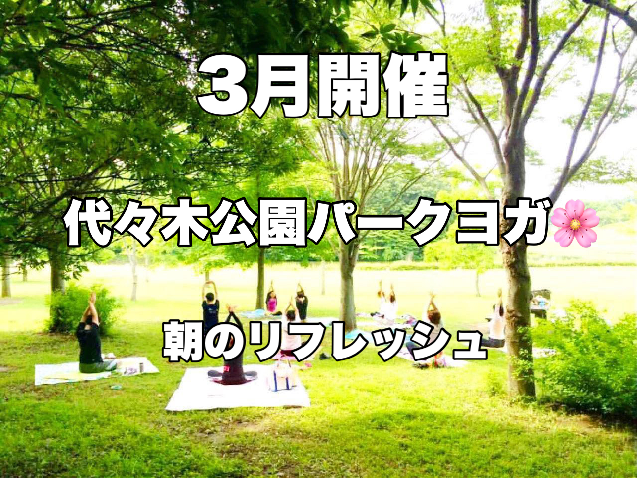 | 実施内容 | : | 3月パークヨガ(代々木公園) 春のやわらかな光と風を感じながら、 冬の間にこわばりやすい肩・背中・股関節を 深い呼吸とゆったりしたフローで 自然の中で過ごす朝の時間は、 ヨガが初めての方、体が硬い方も安心してご参加ください。 代々木公園 |