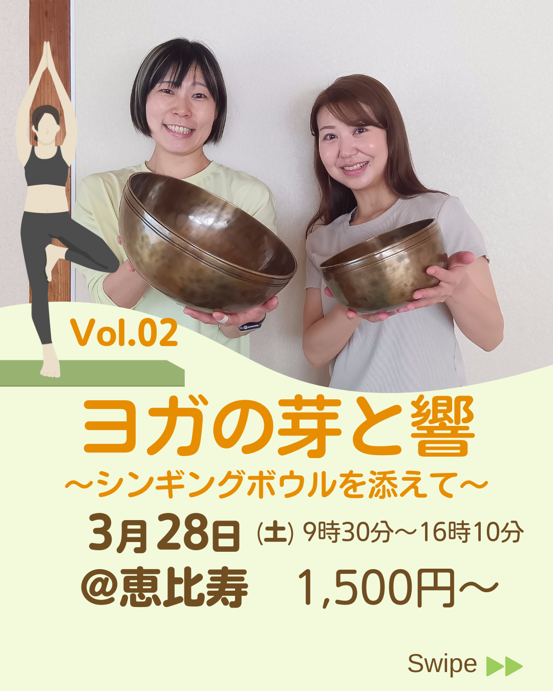 | 実施内容 | : | 若手インストラクターによる、シンギングボウルの生演奏付きのヨ 【コンセプト】 シンギングボウルの「響き」を添えて 緊張と緩和。フレッシュさと深み。 【タイムテーブル】 ※残は、2/24 21時時点 |