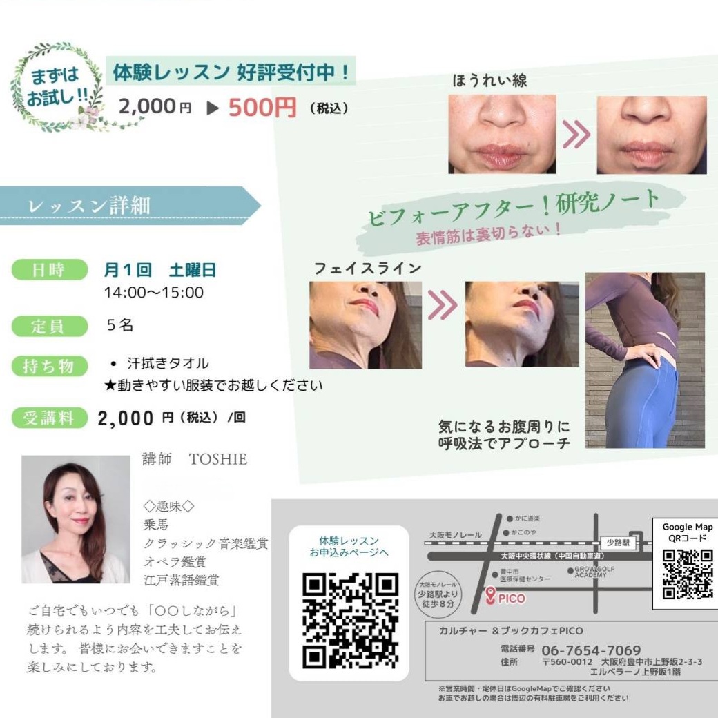 | 難易度 | : | 難易度★ 初心者歓迎。顔の表情筋を動かし、全身運動を緩やかに行います。 |