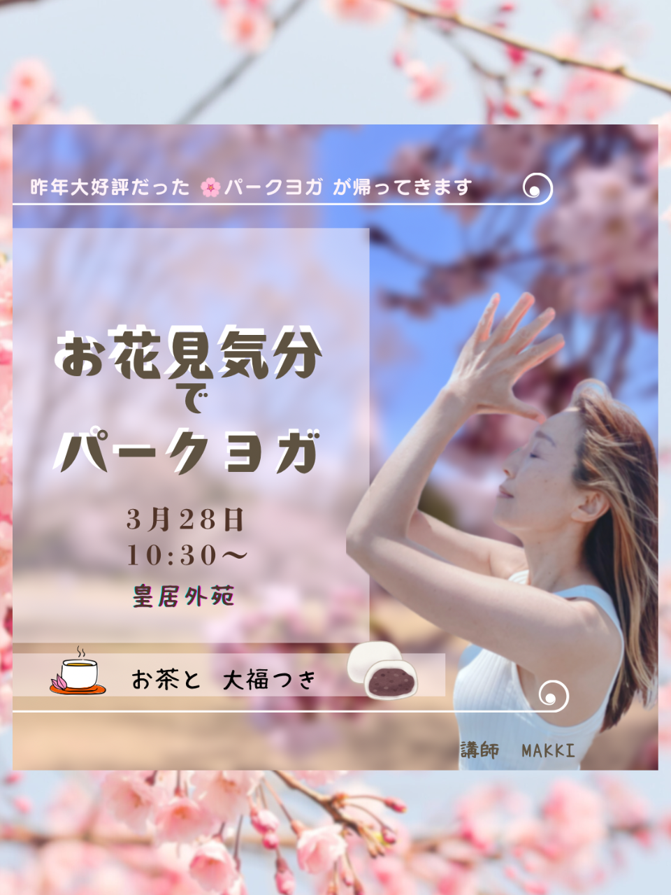 | イベント名 | : | お花見気分でパークヨガ【皇居外苑】お茶と大福つき昨年大好評のヨガイベントが今年も開催されます |